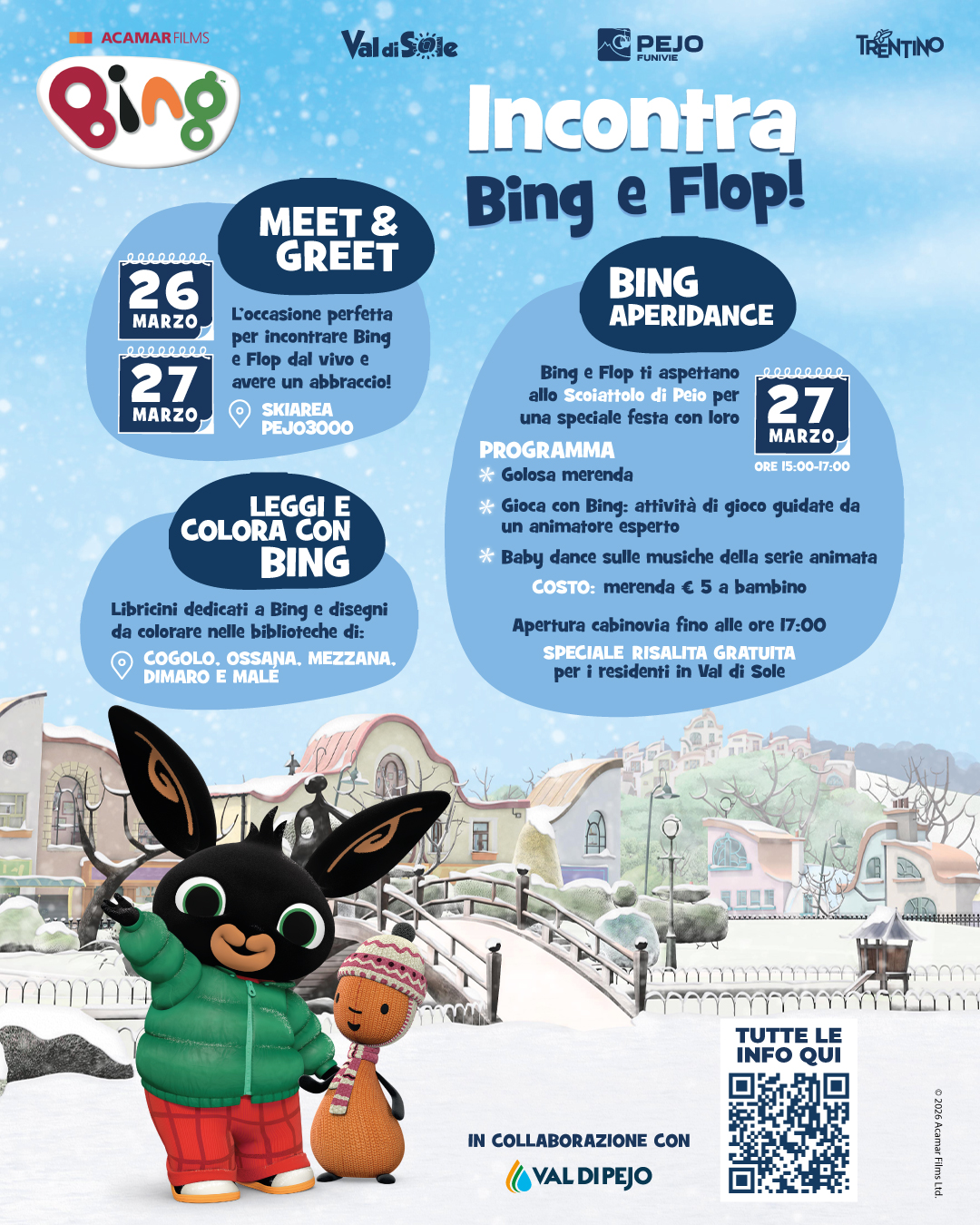 Sì, hai letto bene. L'amato Bing e il suo amico Flop vi aspettano sulla neve della Skiarea Pejo3000 per tanti momenti di gioco e divertimento. I tuoi bambini potranno abbracciare Bing e Flop in carne e ossa, ballare e perfino fare merenda con loro!
